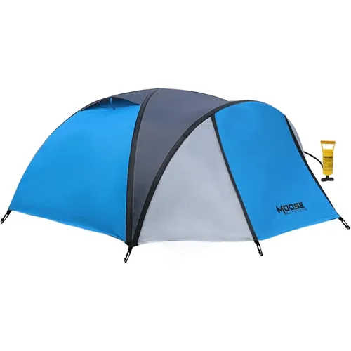 This four-person tunnel tent’s large dimensions provide a spacious vestibule that can accommodate even the tallest of adults, not to mention camping chairs and tables. According to reviews, the tent is easy to set up and is dark as promised. However, some users reported feeling stuffy, while others said there were openings that could allow water and/or wildlife to enter the tent. A pump is also not included with this tent.